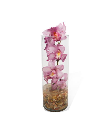 A simple statement of elegance. Our Artisan Stem features a single premium pink cymbidium orchid stem, artfully displayed in a sleek cylinder vase. Smooth river rocks anchor the design, adding natural texture and balance while highlighting the orchid’s long line of delicate, luxurious blooms.