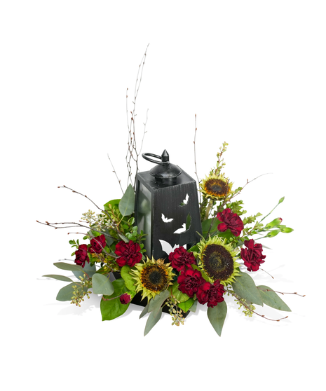 Petal-less sunflowers and burgundy mini carnations create a rich, moody palette that stands out against lush greenery. Birch twigs add natural texture and height, drawing the eye toward the centerpiece’s focal point—a black bat lantern that casts an enchanting glow. Designed with three-sided balance, it’s perfect for displaying on a dining or buffet table. Ideal for Halloween gatherings, it brings just the right mix of eerie elegance and festive flair.