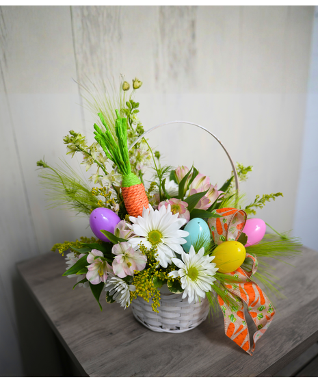 Hop into spring with a cheerful white Easter basket filled with happy daisies and soft light pink Peruvian lilies. Topped with a playful rope carrot, matching ribbon, and colorful Easter eggs, it looks like something Mr. Rabbit picked fresh from his garden!