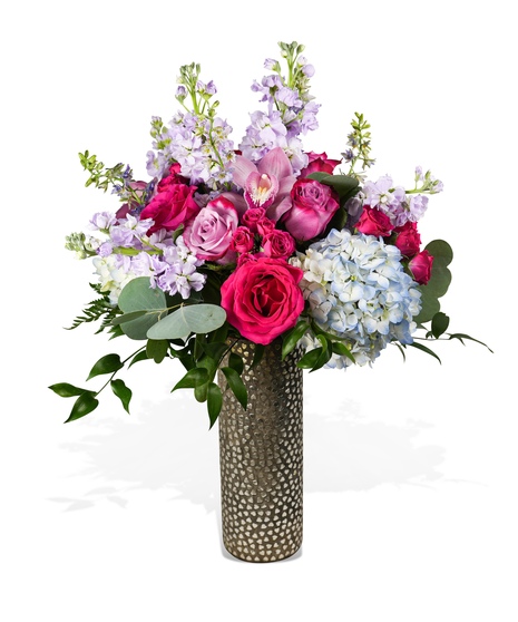 This bouquet looks like it was gathered from a dreamy garden at sunset, with blue hydrangeas and lavender roses glowing softly. Tall stems of stock and larkspur stretch upward, giving it a modern topiary feel that’s full of movement. Purple cymbidium orchids add a surprise touch, like little treasures tucked in just for fun. The metallic heart hobnail tin brings the romance, catching the light in the sweetest way. It’s perfect for anniversaries, Valentine’s Day, or any moment you want to say “I adore you” in a big, colorful way.