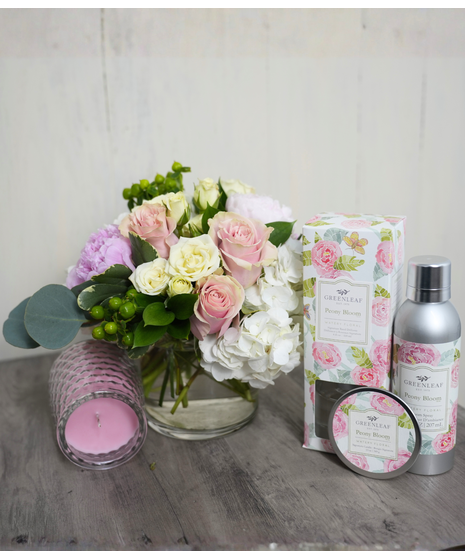 Featuring five peonies as the focal point, this lush design is complemented by a beautiful selection of seasonal flowers and accented with rich, fresh greenery.