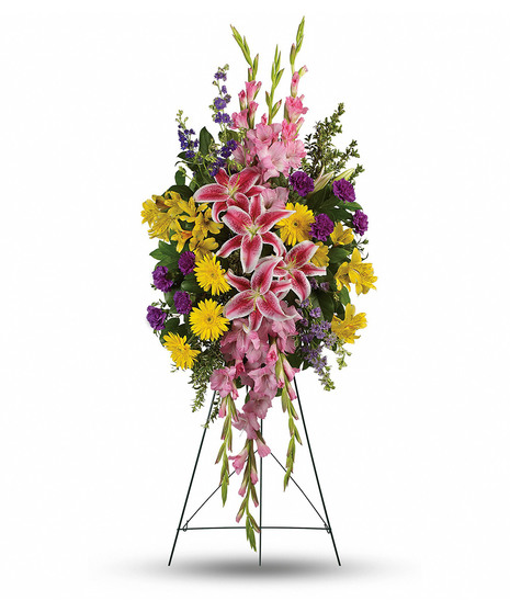 The glorious pink, yellow and purple blooms of this bright, uplifting spray bring a reverent sense of joy and gratitude to the memorial service.