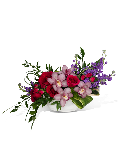 Modern, sculptural, and undeniably romantic, this Valentine’s Day arrangement makes a statement effortlessly. Set in a heavy-weight white concrete container, the one-sided asymmetrical design showcases lush roses paired with cymbidium orchids in soft blush tones, accented by delicate purple blooms and layers of rich, flowing greenery. Thoughtfully placed textures and organic movement create a refined balance between strength and softness.