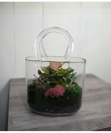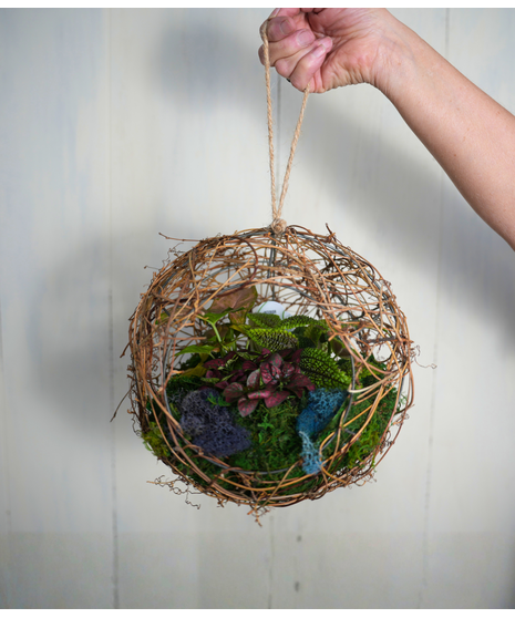 A living terrarium featuring a variety of small plants and natural moss arranged in a glass container. Choose from a decorative grapevine ball or a neat purse-style container, each creating a unique display for a desk, shelf, or tabletop.